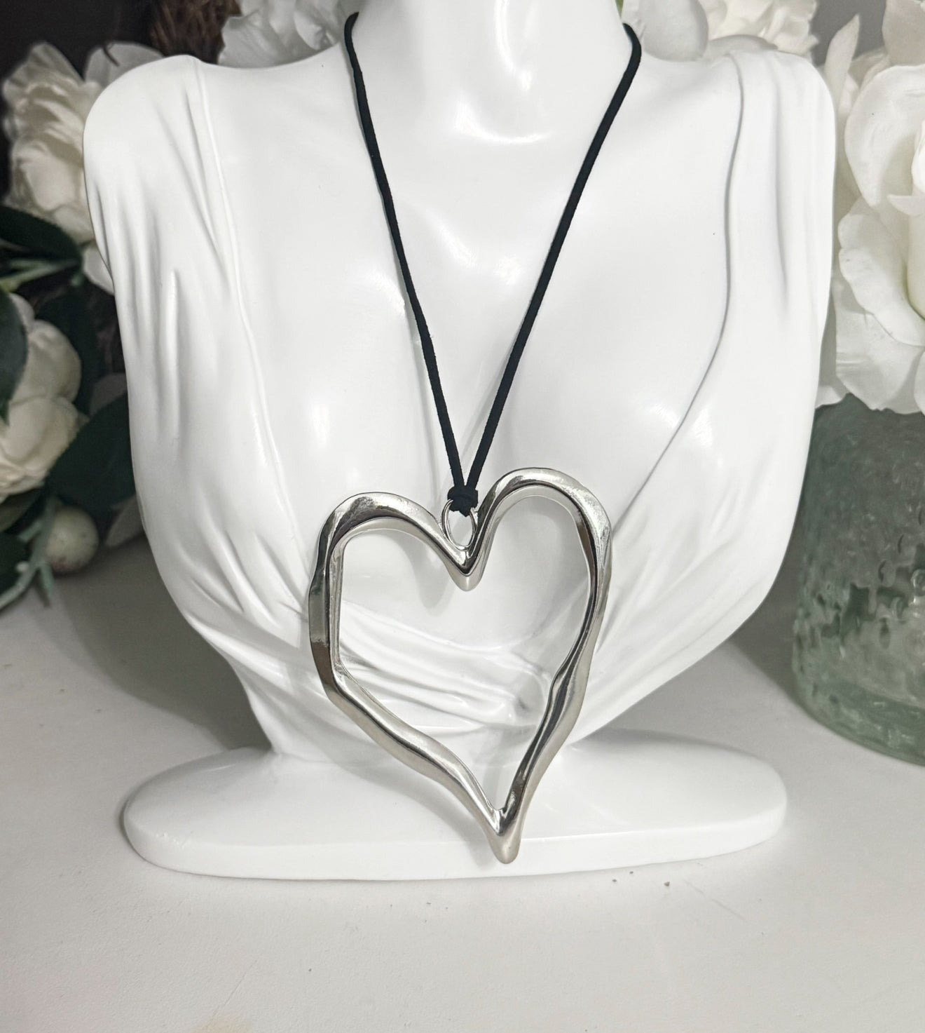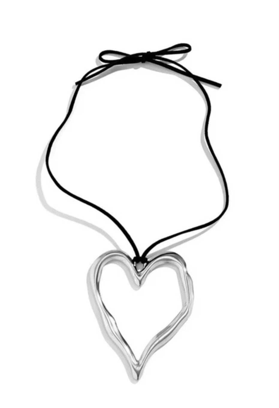 This silver adjustable necklace features a large heart design, perfect for adding a touch of romance to any outfit. Easily tie it in a knot or bow for a customizable fit. Made with high-quality materials, it's a versatile and elegant addition to any jewelry collection. 2 1/2” wide X 3 1/2” long. #heart #necklace